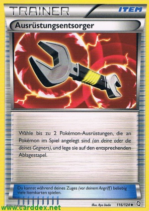 Beschreibung: Wähle bis zu 2 Pokémon-Ausrüstungen, die an Pokémon im Spiel angelegt sind (an deine oder die deines Gegners), und lege sie auf den entsprechenden Ablagestapel.