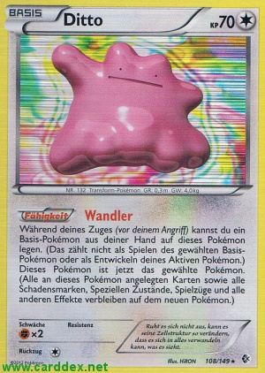 Während deines Zuges (vor deinem Angriff) kannst du ein Basis-Pokémon aus deiner Hand auf dieses Pokémon legen. (Das zählt nicht als Spielen des gewählten Basis-Pokémon oder als Entwickeln deines Aktiven Pokémon.) Dieses Pokémon ist jetzt das gewählte Pokémon. (Alle an dieses Pokémon angelegten Karten sowie alle Schadensmarken, Speziellen Zustände, Spielzüge und alle anderen Effekte verbleiben auf dem neuen Pokémon.)
