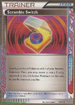Beschreibung: Tausche dein Aktives Pokémon gegen 1 Pokémon auf deiner Bank aus. Du kannst anschließend beliebig viele der an dein altes Aktives Pokémon angelegten Energien auf dein neues Aktives Pokémon verschieben.