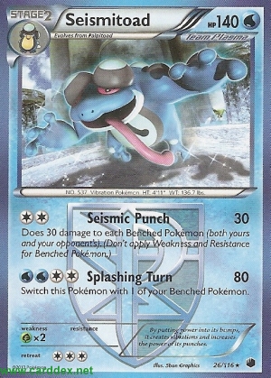 Kosten: Dieser Angriff fügt jedem Pokémon auf der Bank (deiner und die deines Gegners) 30 Schadenspunkte zu. (Wende Schwäche und Resistenz bei Pokémon auf der Bank nicht an.)  Schaden: