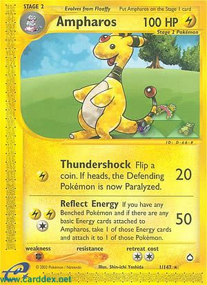 Kosten: Falls du mindestens ein Pokémon auf deiner Bank hast und mindestens eine Basis-Energiekarte an Ampharos angelegt ist, nimm 1 dieser Energiekarten und lege sie an 1 dieser Pokémon an.  Schaden: