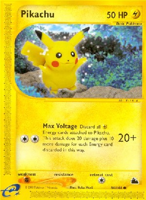 Lege alle an Pikachu angelegten -Energiekarten auf deinen Ablagestapel. Dieser Angriff fügt 20 Schadenspunkte plus 10 weitere Schadenspunkte für jede auf diese Weise abgelegte Energiekarte zu.