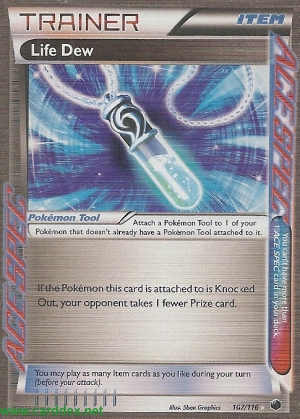 Lege Lebenstau an 1 deiner Pokémon an, das keine Pokémon-Ausrüstung hat. Wenn dieses Pokémon kampfunfähig wird, lege diese Karte auf deinen Ablagestapel.