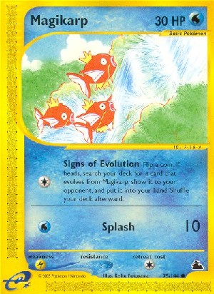 Wirf eine Münze. Durchsuche bei 'Kopf' dein Deck nach einer Karte, die aus Karpador entsteht, zeige sie deinem Gegner und nimm sie auf deine Hand. Mische dein Deck danach.