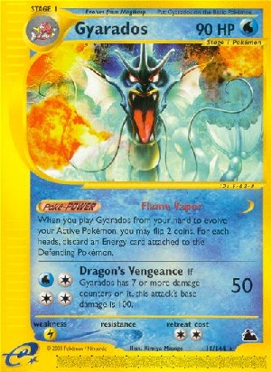 Wenn du Garados aus deiner Hand spielst, um dein aktives Pokémon zu entwickeln, kannst du 2 Münzen werfen. Lege für jeden geworfenen 'Kopf' eine an das verteidigende Pokémon angelegte Energiekarte auf den Ablagestapel deines Gegners.